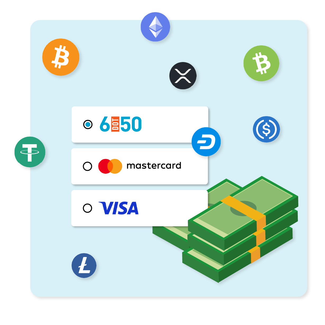 Accept 6DOT50 as payment & access the untapped cash and cryptocurrency customer base.
